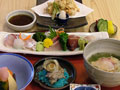 せっかくの伊勢志摩でゴルフですから、美味しい海の幸を食べて帰ってください。鮮度抜群の鮮魚のお刺身にさざえの壷焼き、上品な味付けの煮物と揚げたての天婦羅、鯛茶漬けが付きます